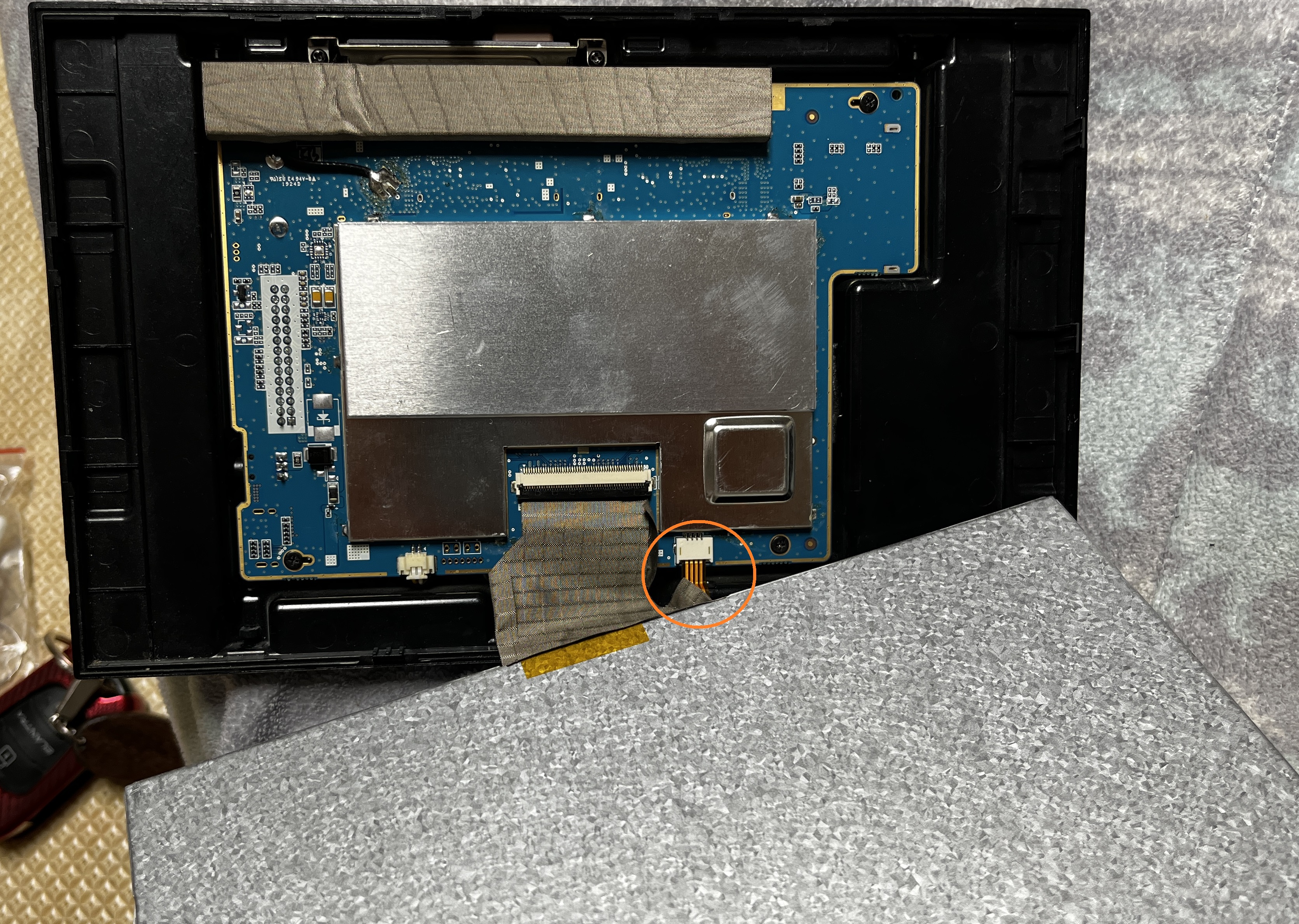 분해된 네비에서 터치패널의 통신 케이블을 분리합니다.