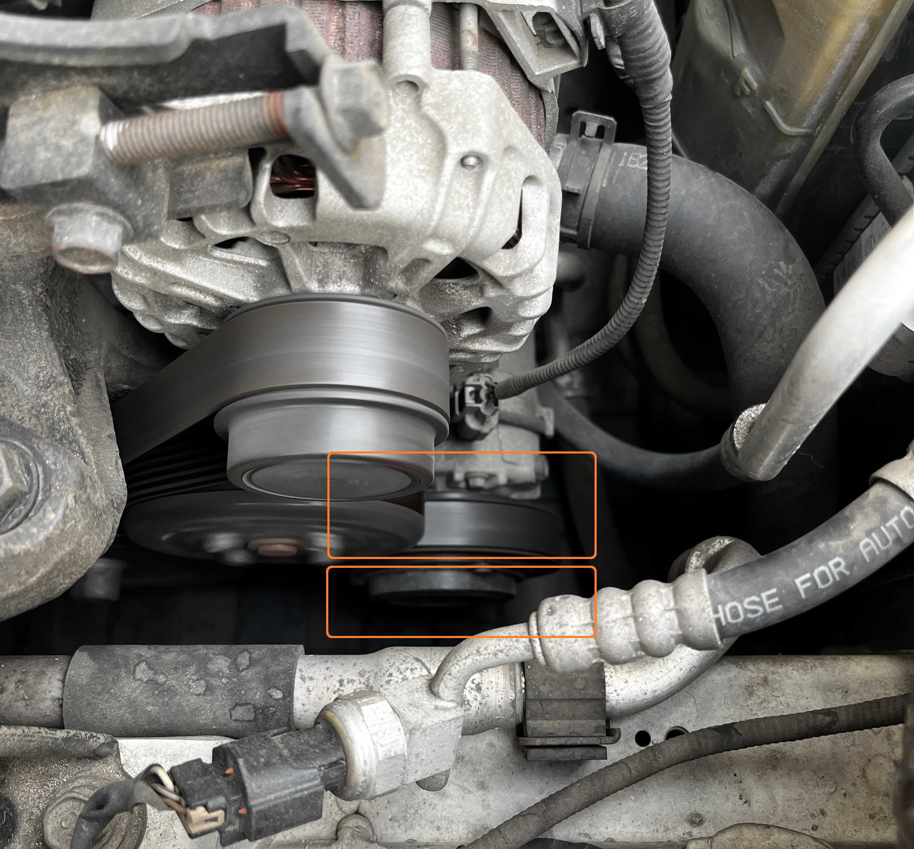마찬가지로 시동을 걸면 위의 벨트는 사진처럼 돌게 되는데, 아래쪽 강조된 영역의 컴프레셔 풀리는 돌지 않습니다.