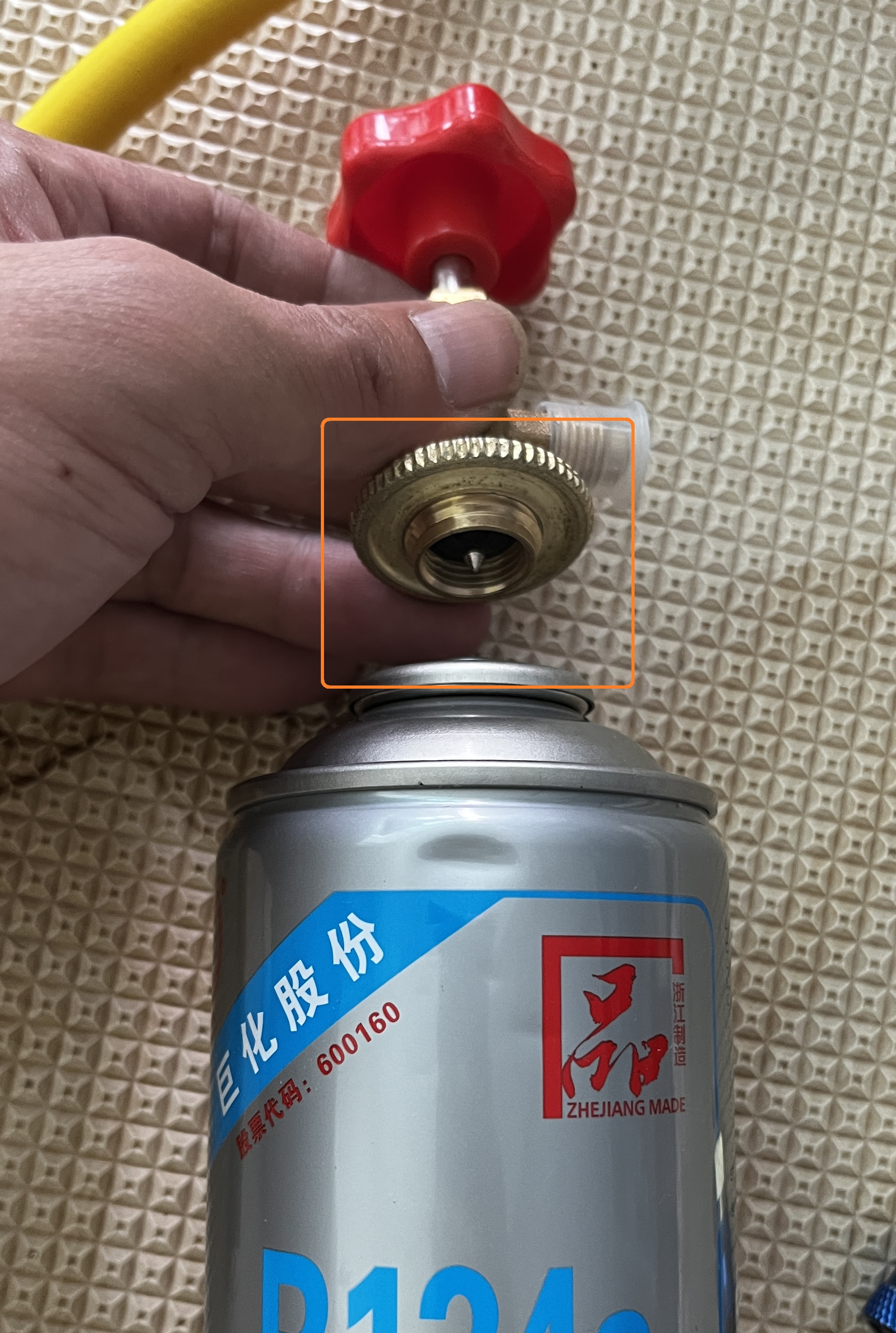 마지막으로 에어컨 가스 캔에 밸브를 연결하고 최대한 잠가 구멍을 낸 후, 다시 밸브를 최대한 후퇴시켜 구멍이 개방되어 가스가 주입되게 하였습니다.
