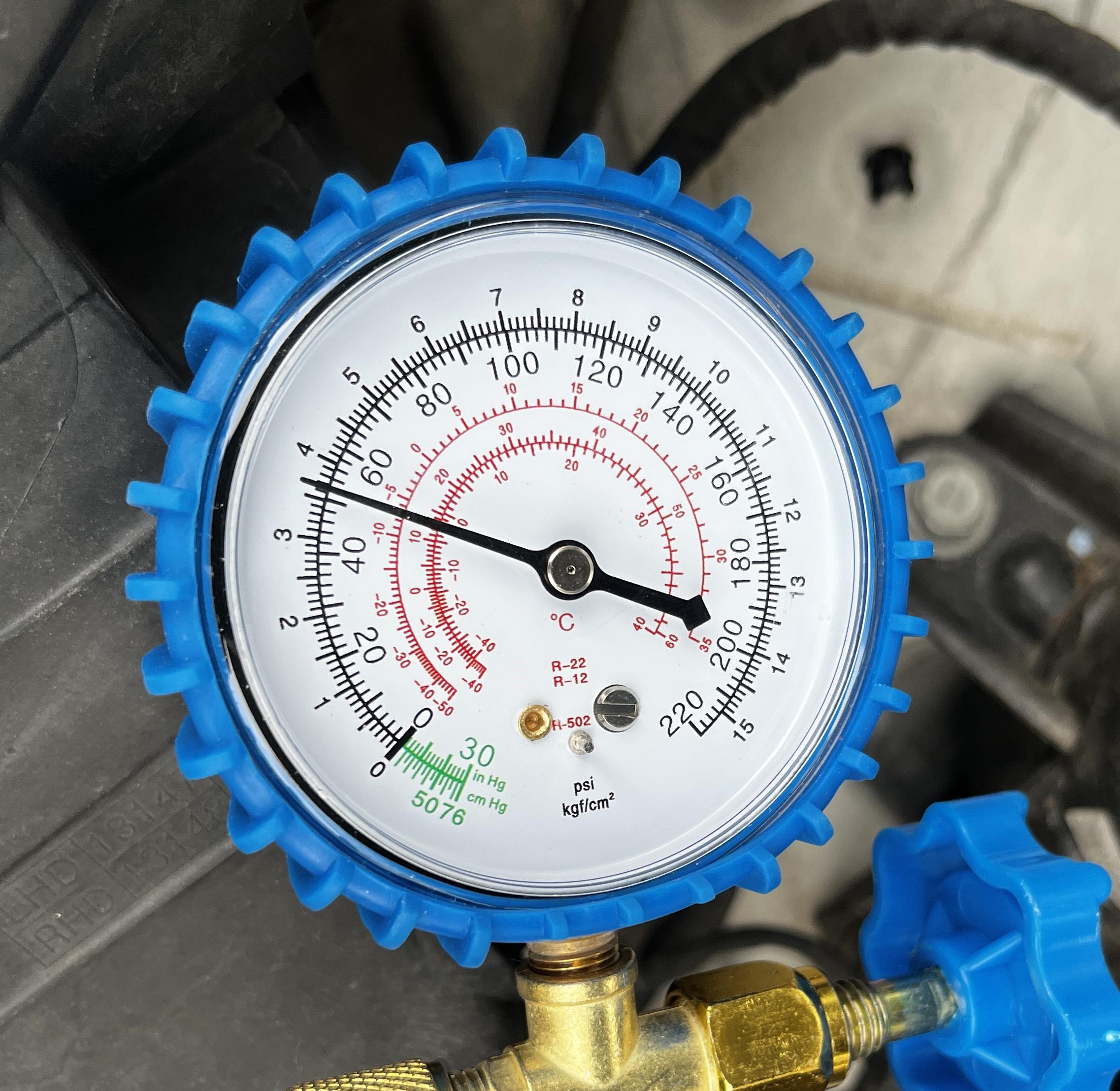 게이지에는 PSI 단위 압력을 확인할 수 있는데, 에어컨 가동 중 저압 배관의 압력은 30~40 PSI가 적당하다 합니다.