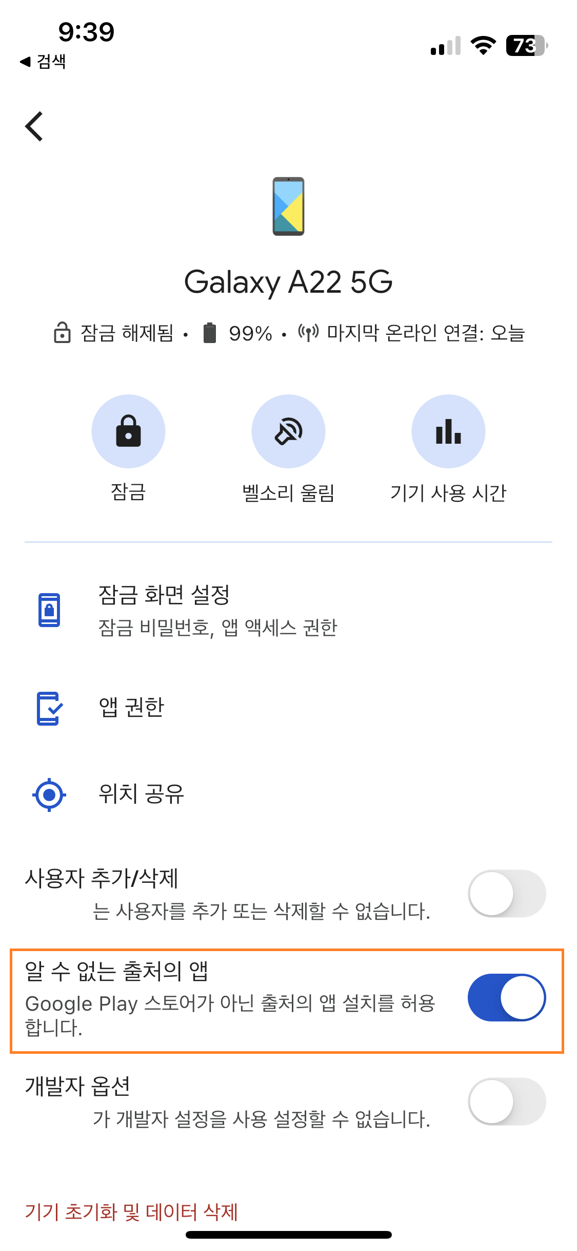 해당 팝업창에서 '기기 설정'을 선택하면 마지막 사진처럼 '알 수 없는 출처의 앱' 설치 옵션 및 '개발자 옵션'을 활성화할 수 있습니다.