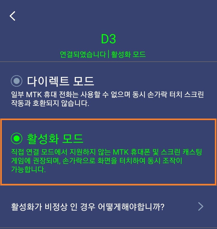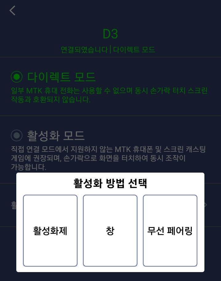 연결이 된 후 '다이렉트 모드' 부분을 다시 터치하면 우측 사진처럼 '활성화 모드'라는 것이 있는데, 이를 활성화해주어야 합니다.