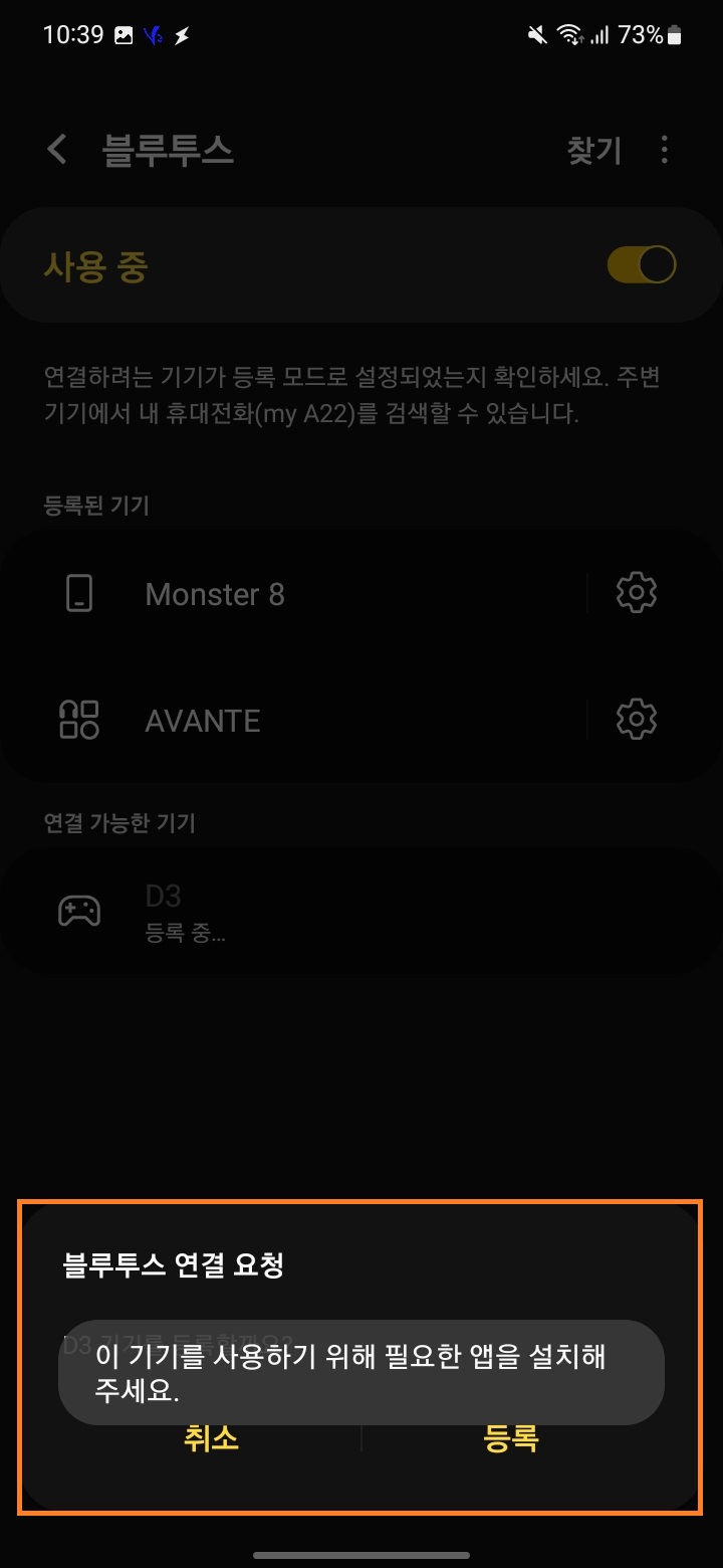 위에서 설치한 shooting plus 앱을 먼저 실행한 후 왼쪽 사진의 '장치가 연결되지 않았습니다' 부분을 우측 사진의 블루투스 설정 화면으로 넘어갑니다. 'D3'라고 되어 있는 기기에 연결한 후 다시 앱으로 돌아갑니다.