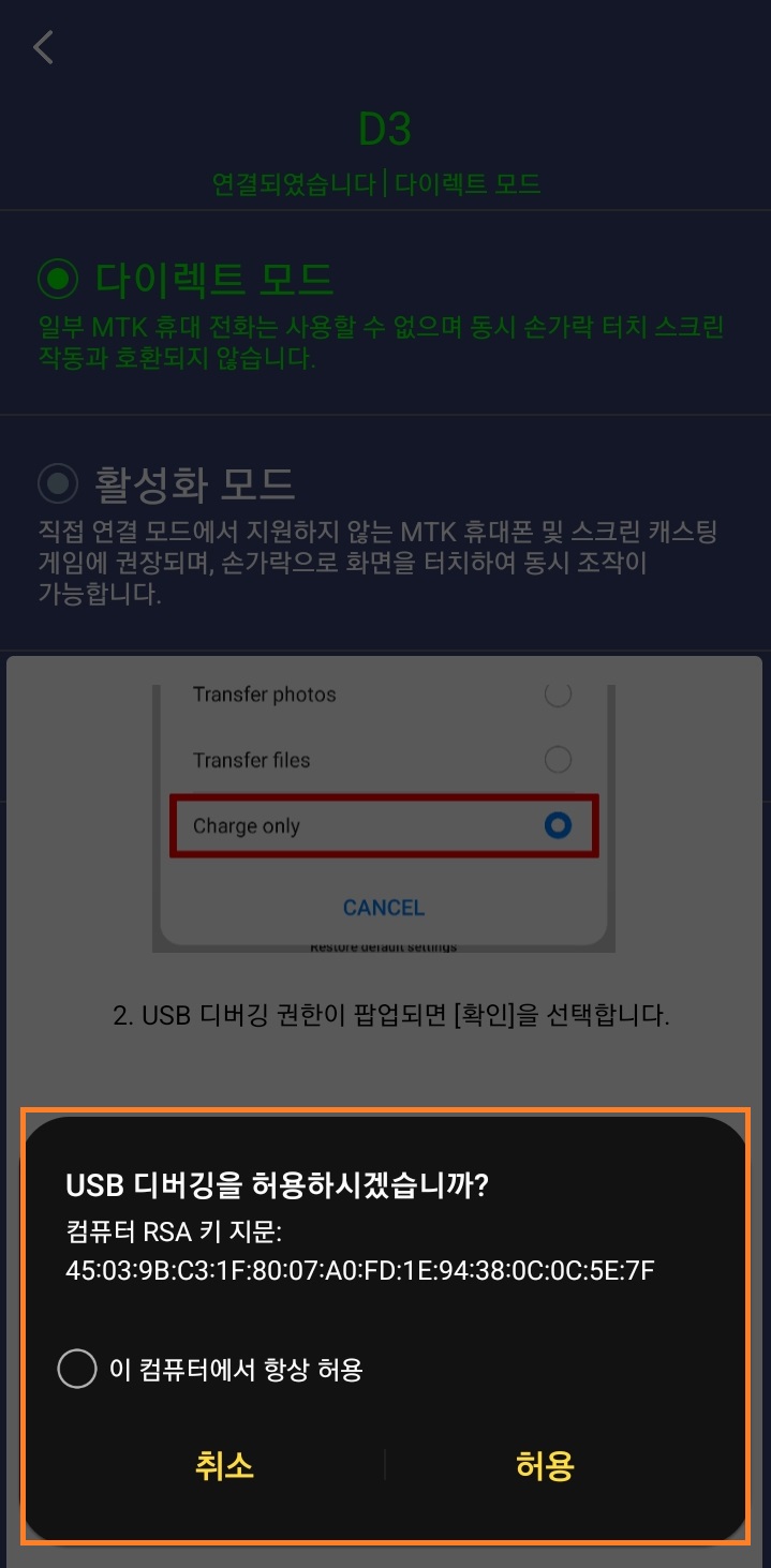 진행 과정에 스마트폰에서 'USB 디버깅'을 허용하겠냐는 창이 뜨면 '허용'을 눌러줍니다.