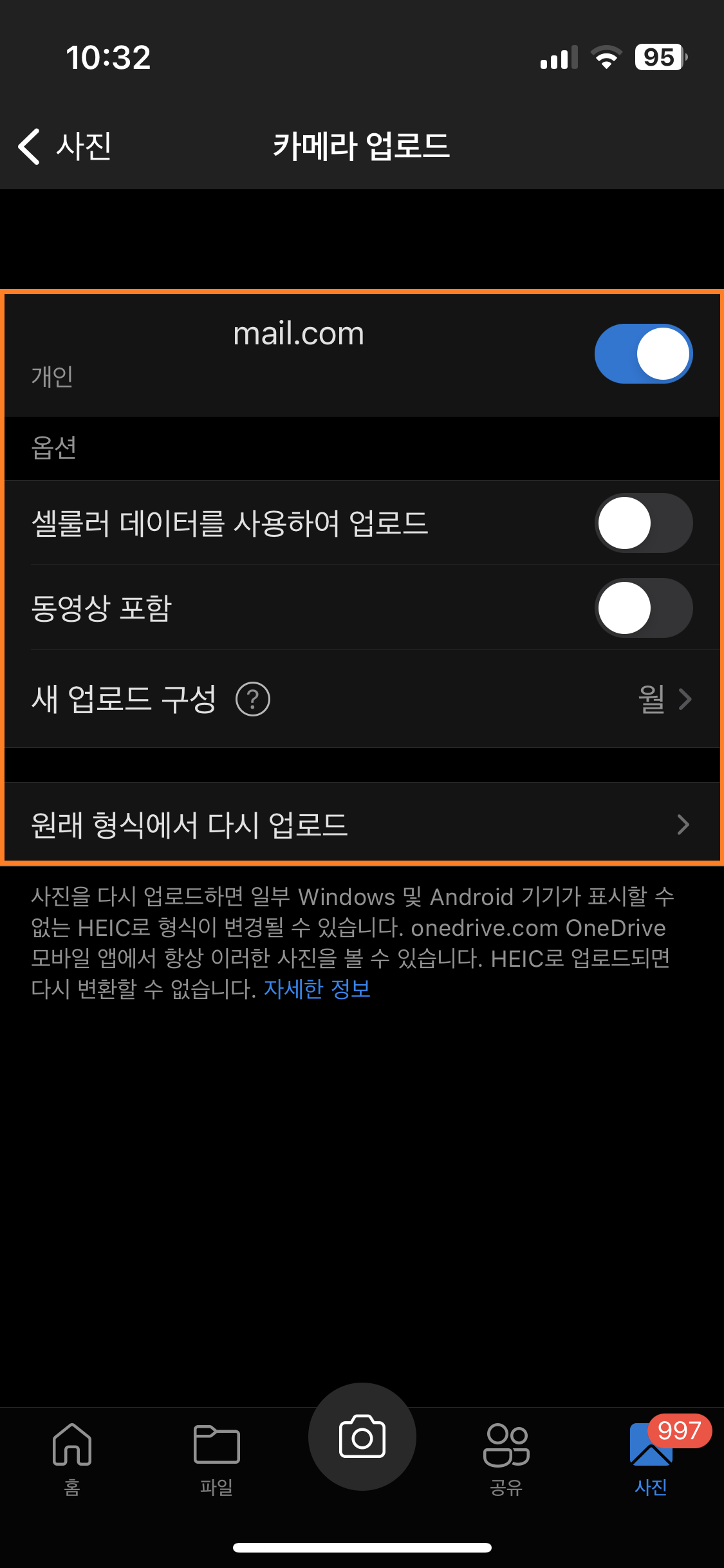 계정 옆의 단추를 활성화해주면 사진 업로드가 되며, 셀룰러에서도 업로드를 할지 여부나, 동영상을 업로드할지 여부를 선택할 수 있습니다.