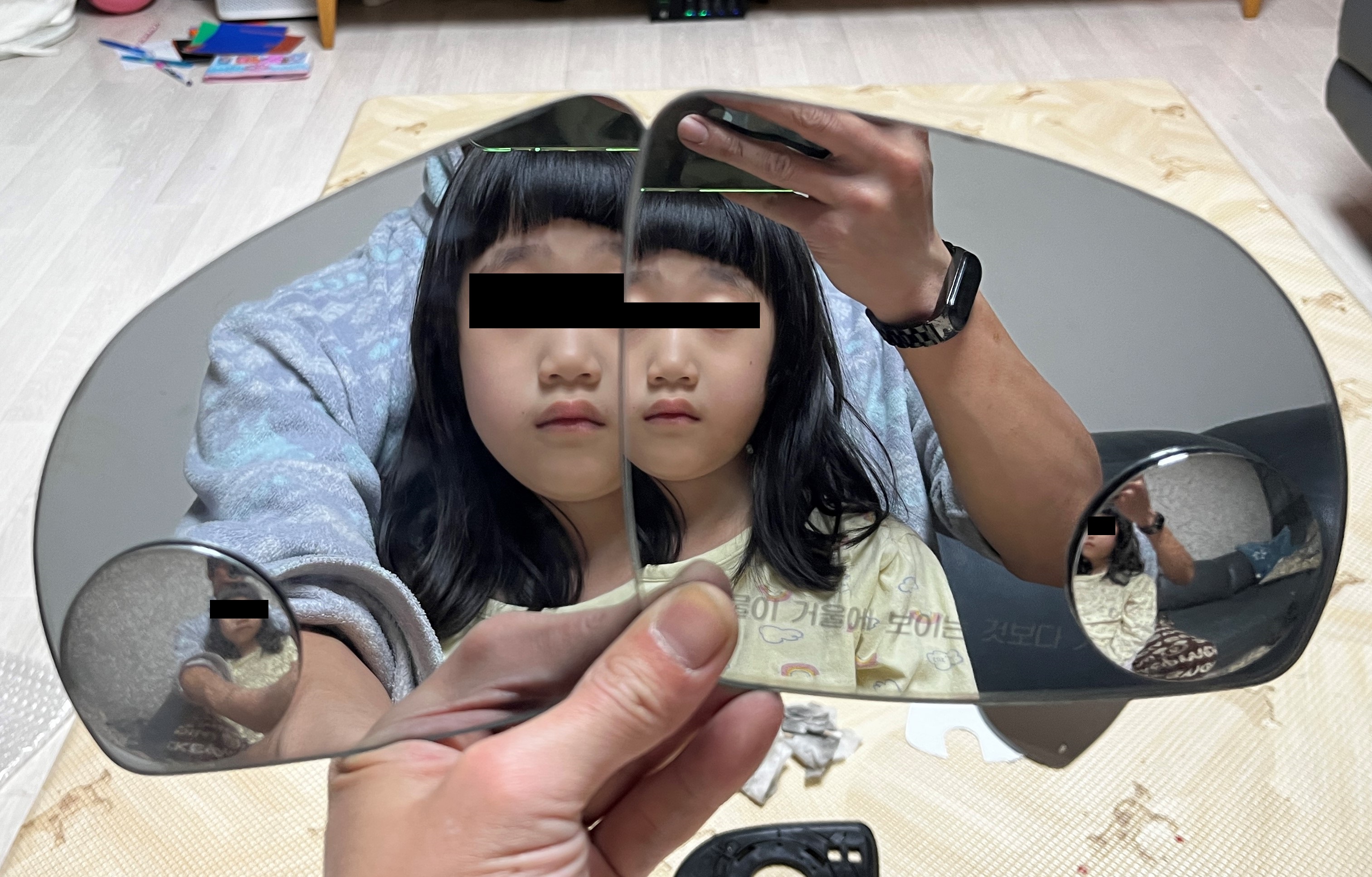 사진과 같이 한쪽은 일반각, 반대쪽은 광각으로 거리감의 차이가 크며, 일반각 거울의 경우 사각지대가 너무 넓습니다.