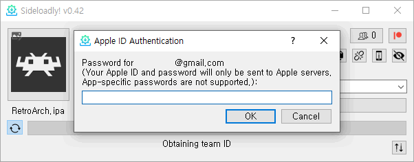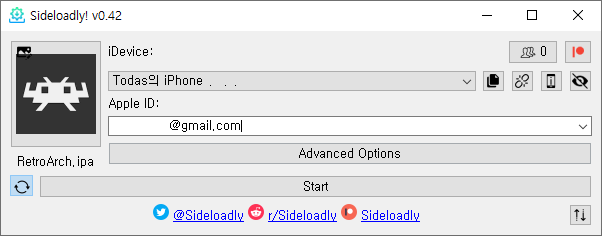 위의 바로가기를 방문하여 최신버전의 FileSwitcherX-*.*.ipa 파일을 내려받은 후에 우측 갈무리의 Sideloadly의 아이콘 부분에 ipa 파일을 드래그한 후 'Start' 단추를 누릅니다.