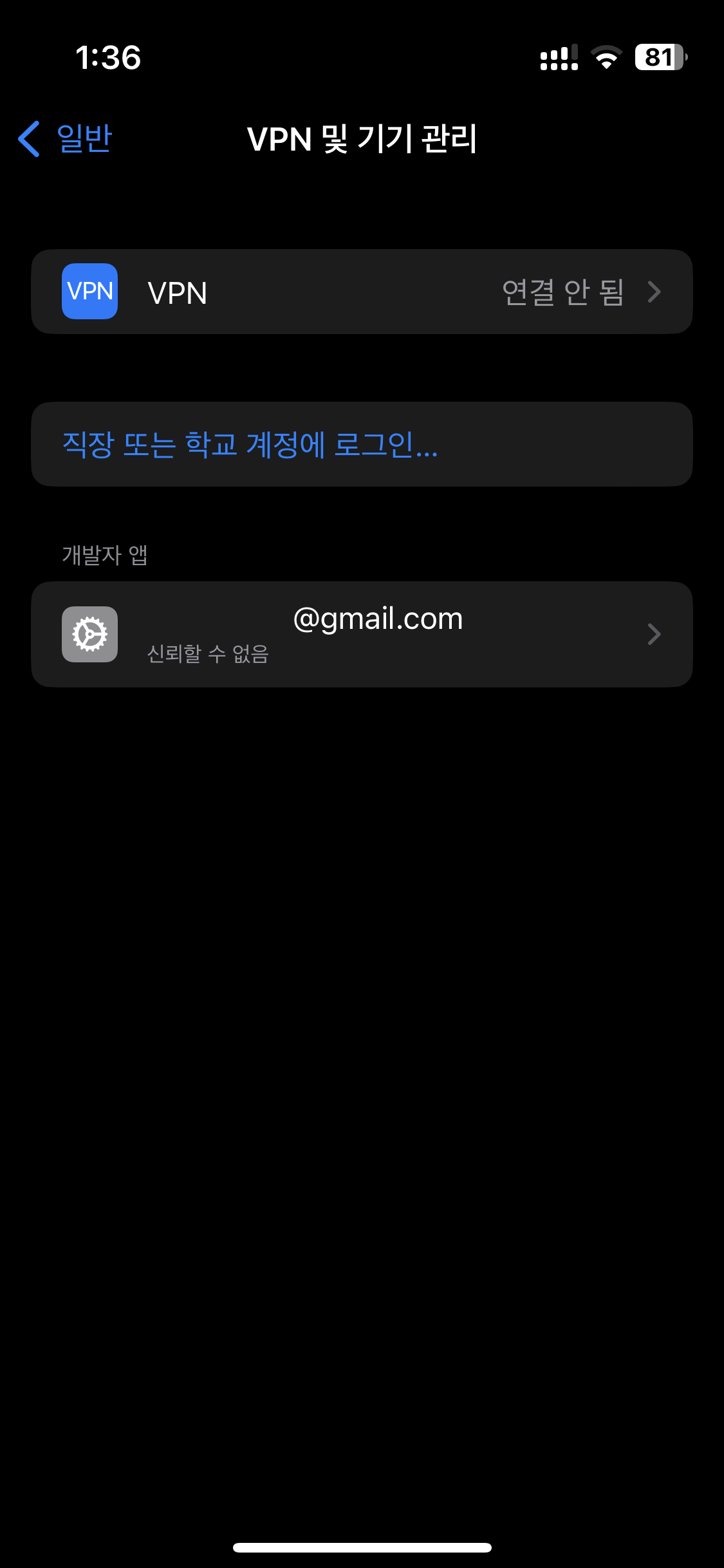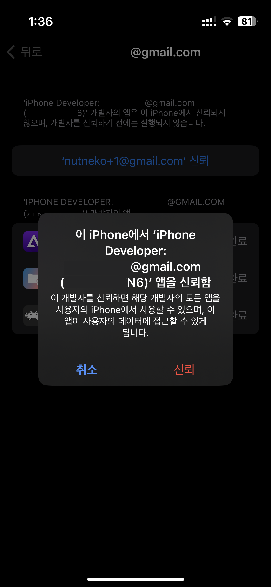 설정 > 일반 > VPN 및 기기 관리로 들어가면 가운데 사진처럼 '개발자 앱'이라는 부분에 위의 계정이 나옵니다.