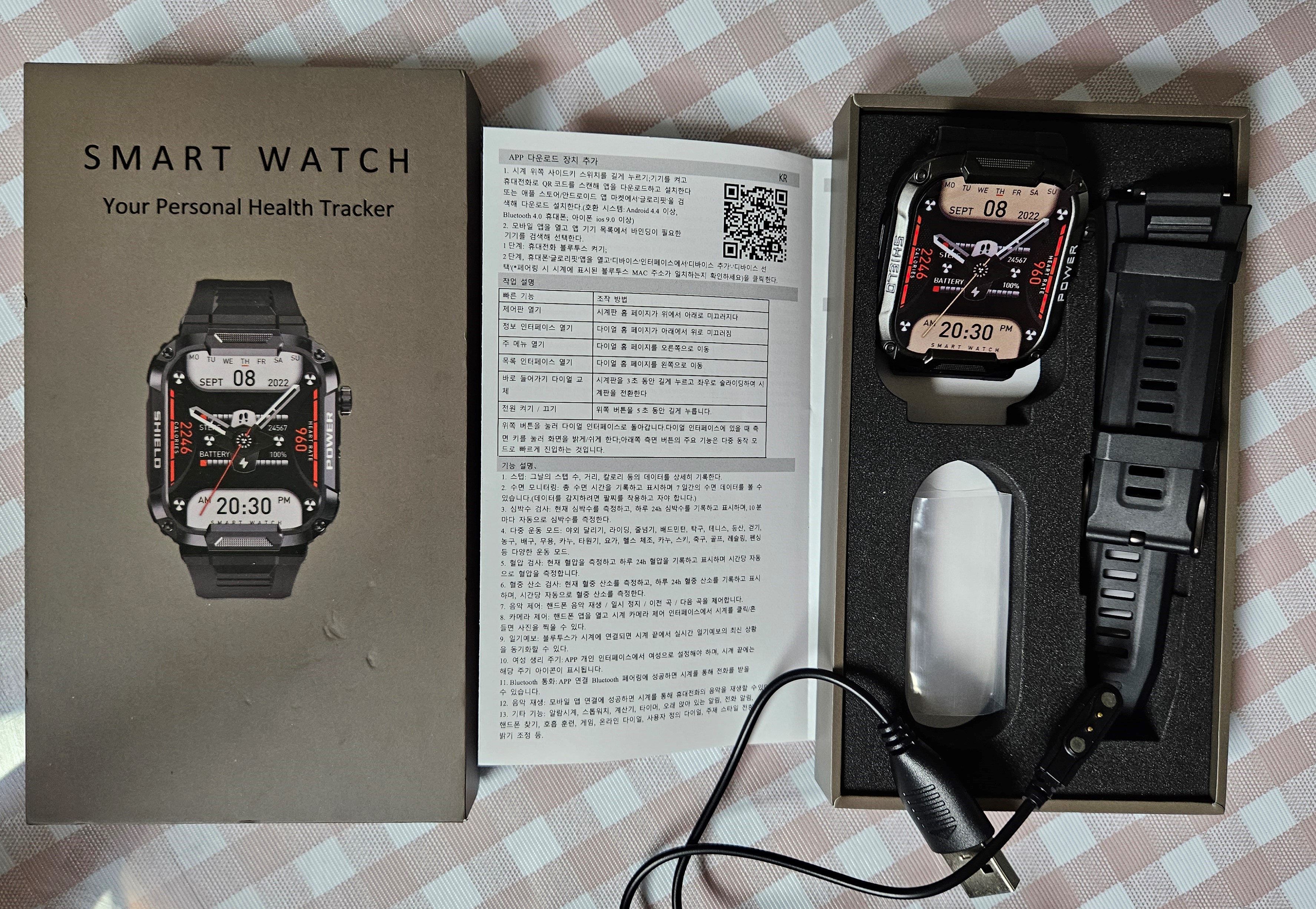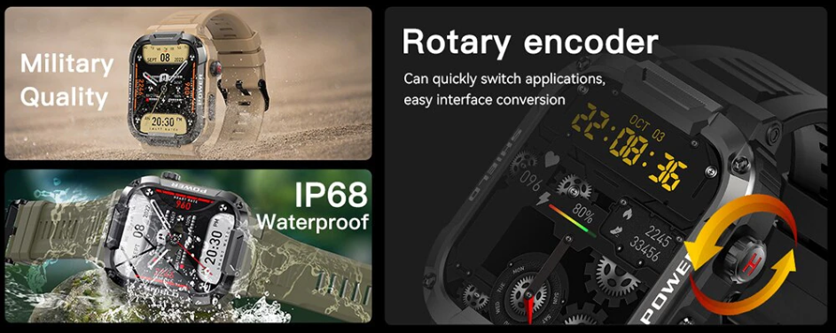 꽁돈대첩 상품인지라 배송은 평일 기준 5일이 걸리지 않았으며, 위 제품소개 사진처럼 IP68 방수방진을 지원하며 회전식 용두가 달려있습니다.