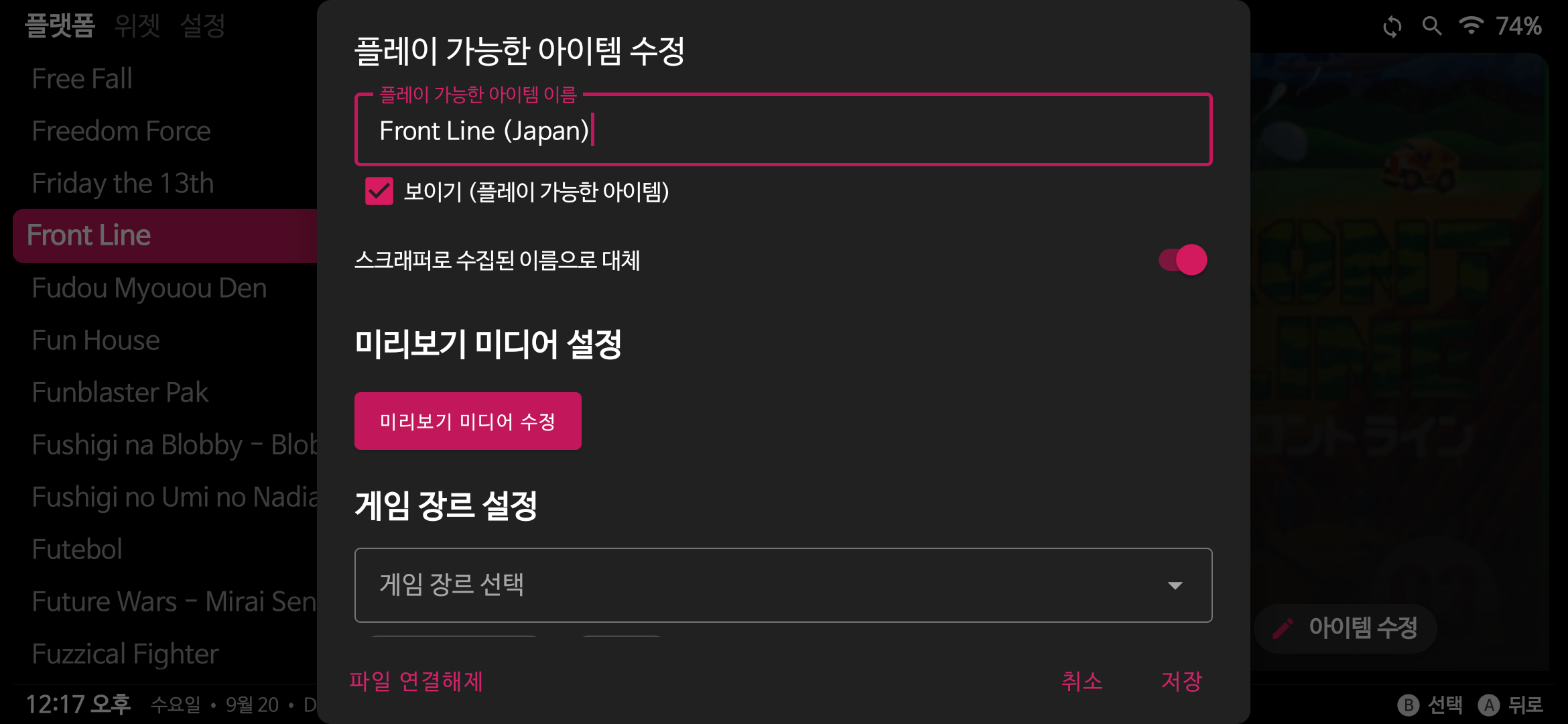 해당 플랫폼의 게임을 구동할 기본 에뮬레이터를 지정하기 위해서는 플랫폼 화면 우측하단의 수정 아이콘을 누르면 오른쪽 사진처럼 '플랫폼 편집' 창이 열립니다.