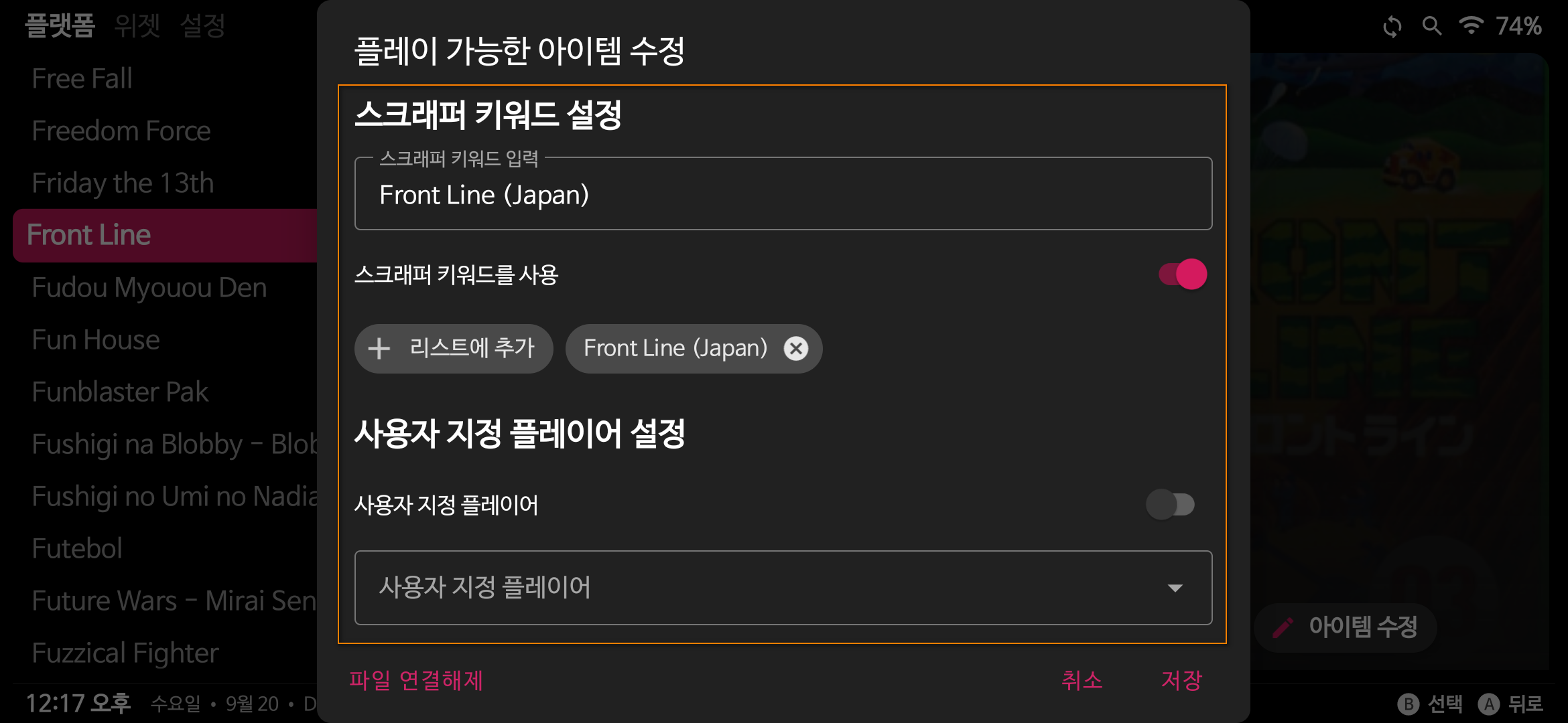 아래의 '사용자 지정 플레이어 설정'에서는 바로 위에서 작업한 기본 에뮬레이터와 무관하게 해당 롬파일에만 별개의 에뮬레이터를 할당할 수 있습니다.