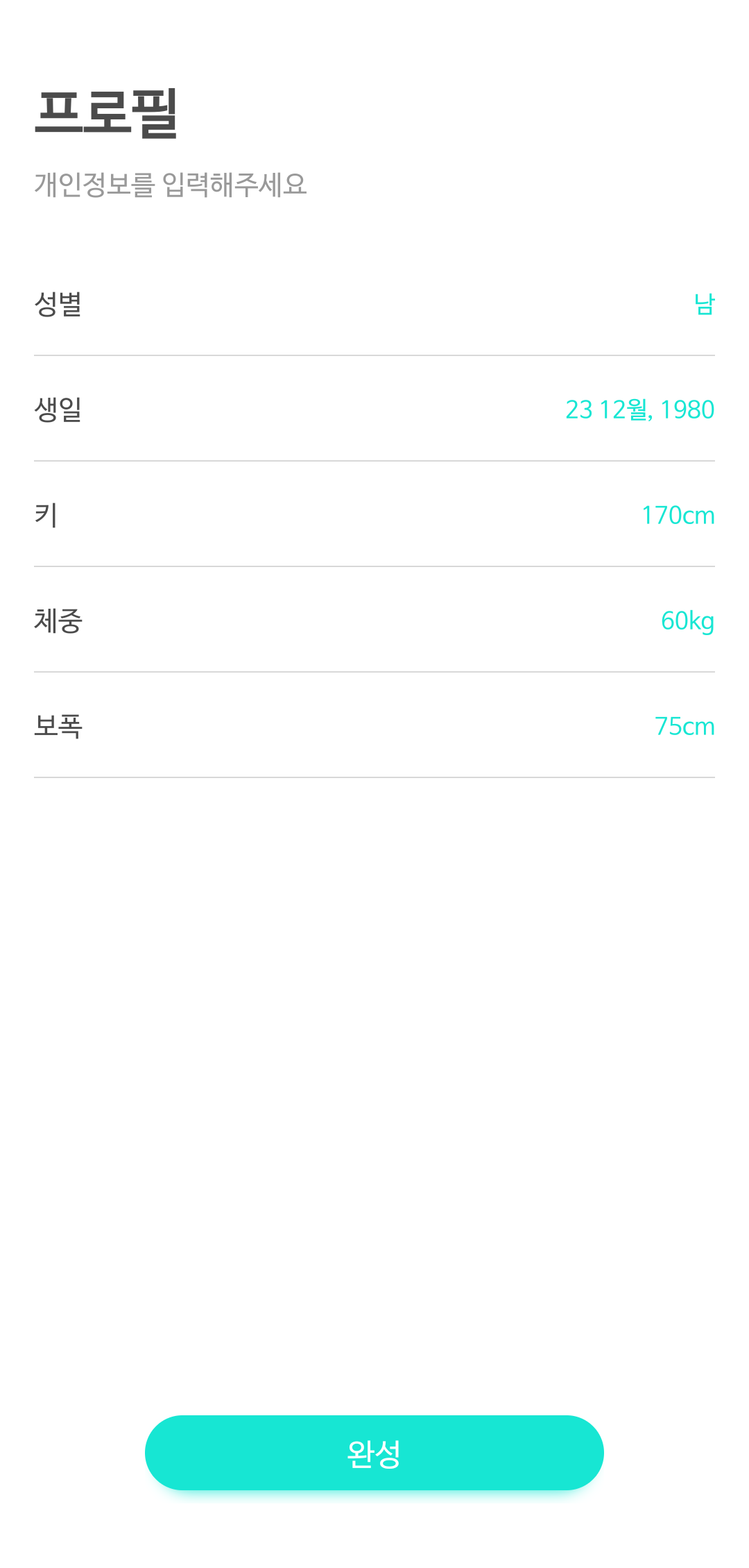 와치와 스마트폰이 연결되면 왼쪽 사진처럼 사용자 프로필을 입력하라 나옵니다.