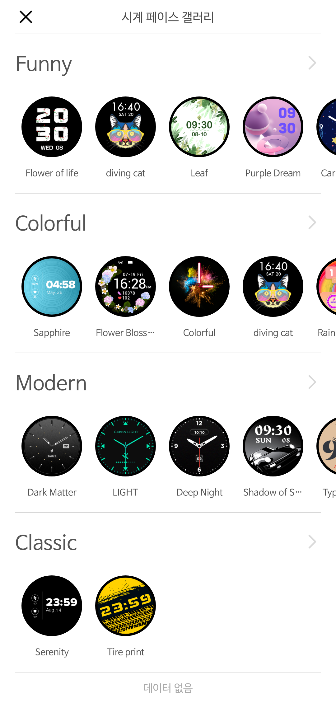 저는 날씨와 배터리 잔량이 나오는 워치페이스면 되는데.... 이 제품은 아쉽게도 날씨가 나오는 워치페이스는 전무합니다.