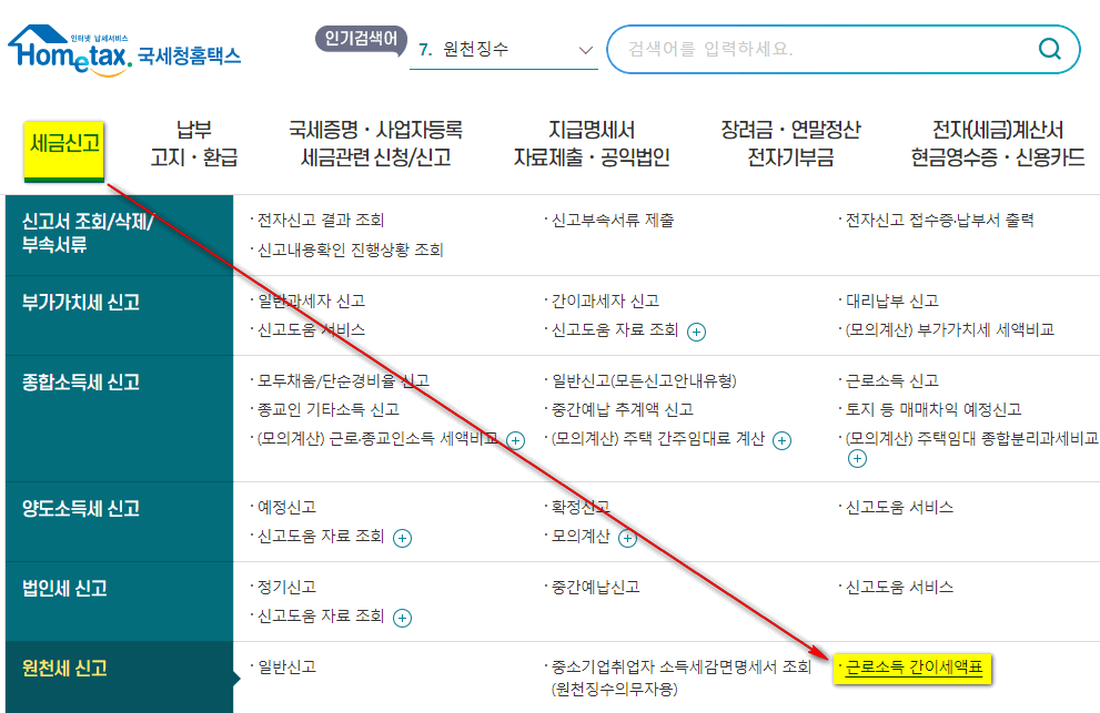 근로소득 간이세액표의 경우 홈택스에서도 조회를 할 수가 있는데, 홈택스에서 조회하는 경우 위 갈무리처럼 '세금신고' > '원천세 신고' > '근로소득 간이세액표' 메뉴에서 조회가 가능합니다.