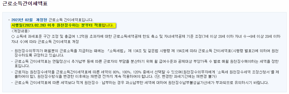 해당 메뉴로 들어가 보면 위와 같은 안내가 나오는데, 근로소득 간이세액표가 고정된 것이 아님을 알 수 있습니다.