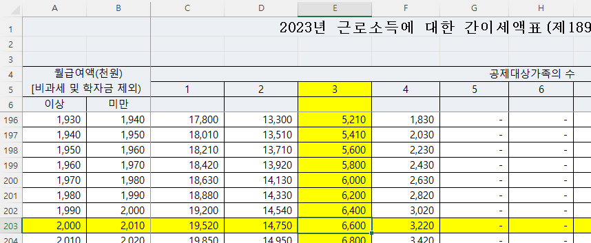 급여대장으로 엑셀을 작성하는 경우에는 '근로소득 간이세액표'를 엑셀 파일로 내려받아, 엑셀의 vlookup 함수를 사용하는 것이 더 정확하고 효율적입니다.