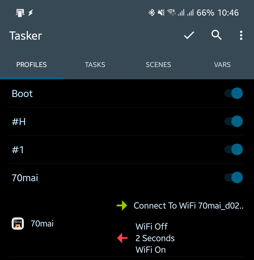이런 번거로운 과정을 생략하기 위해 태스커를 이용하여 위와 같이 70mai 앱이 실행되면 블랙박스의 핫스팟에 연결하고, 앱이 종료되면 와이파이가 꺼지게 설정을 해둔 상태입니다.