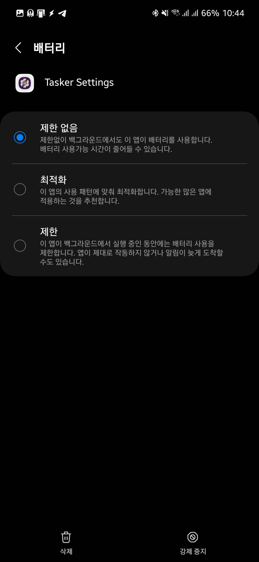 모든 권한을 다 주고, 우측 스크린샷과 같이 배터리 제한을 해제하면 이제 태스커에서 와이파이를 켜고 끄는 기능이 제대로 동작합니다.