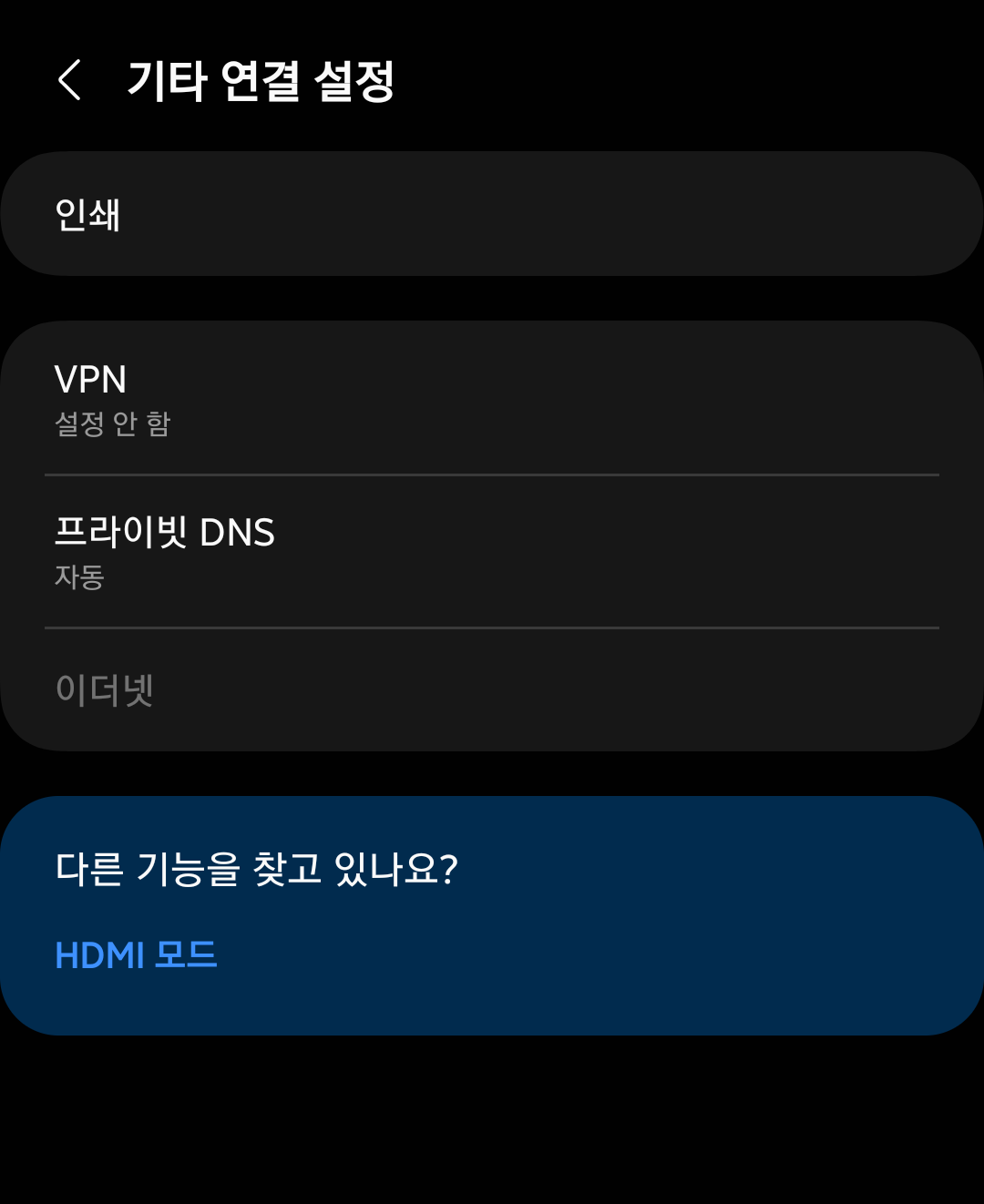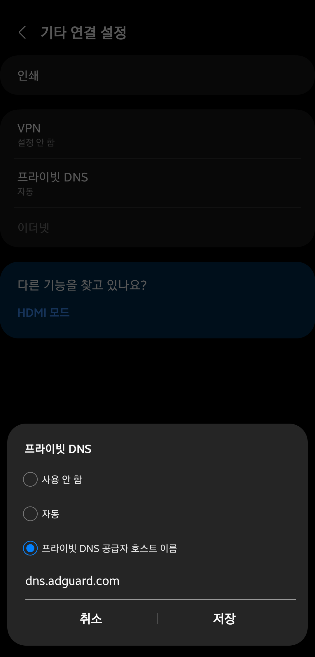 그럼 갤럭시 기준으로 '기타 연결 설정' 메뉴 하위에 '프라이빗 DNS' 항목이 있습니다.