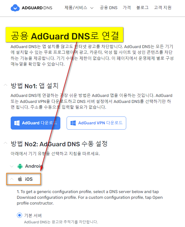공용 AdGuard DNS로 연결 → AdGuard DNS 수동 설정 → iOS에서 확인하면 됩니다.