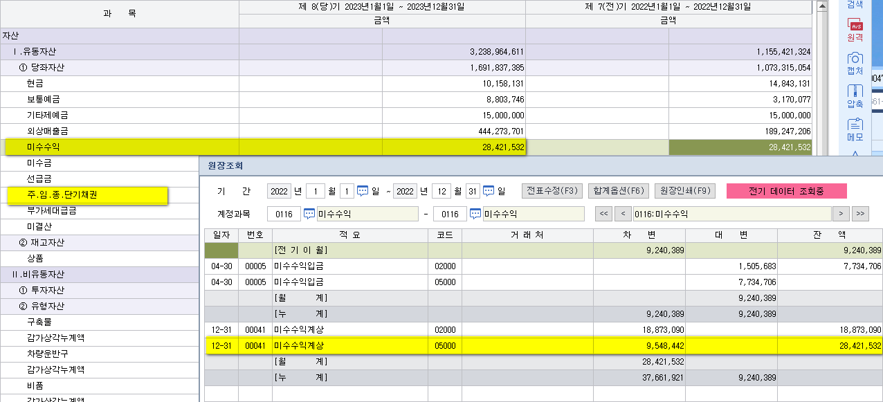 전기분 재무상태표를 열어, '미수수익'이나 '가지급금' 계정이 존재하는지 확인합니다.