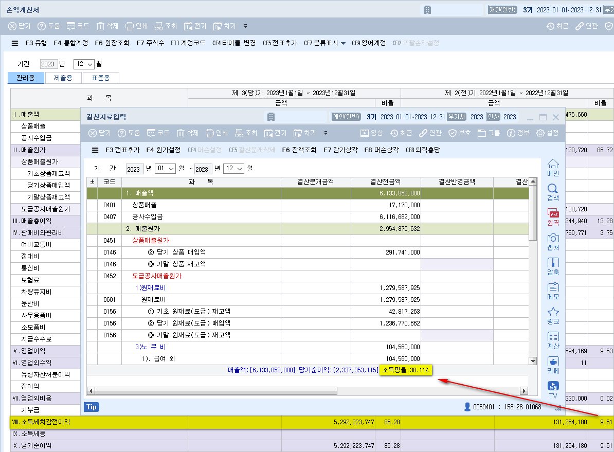 마지막으로 결산자료입력에 들어가 감가상각비와 재고를 반영해 주고, 전년의 소득율과 비교해 봅니다.