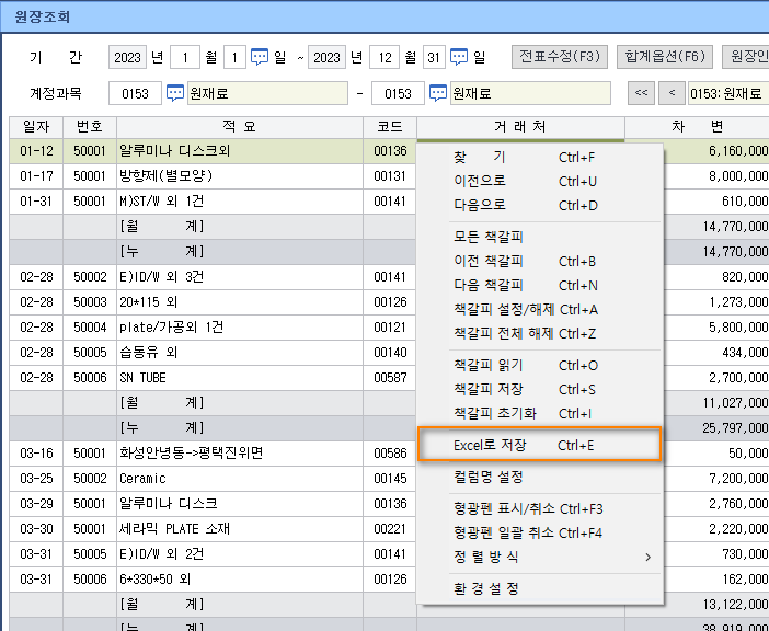 예시로 원재료 계정을 확인하기 위해 원재료의 원장에서 마우스 우클릭을 하거나 단축키를 눌러 현재 원장을 엑셀파일로 저장해 줍니다.