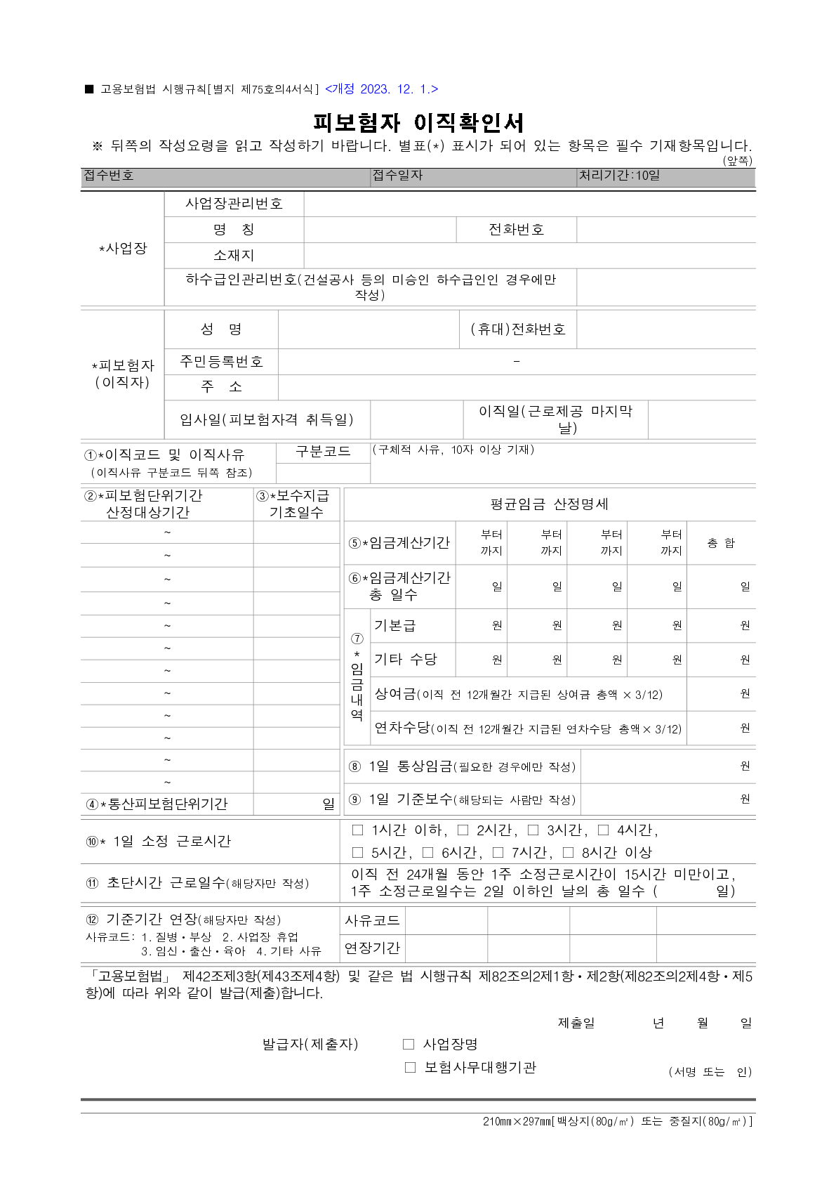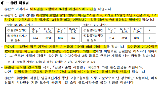 ※ 예) 12. 24. 이직자의 경우 가장 위 칸에는 12. 1. ~ 12. 24.를 적고 그 아래 칸에는 11. 1. ~ 11. 30., 10. 1.~ 10. 31.을 적되, 통산 피보험단위기간(④)이 180일이 되는 날까지만 적습니다(통상 7 ~ 8개월 작성하면 됩니다).