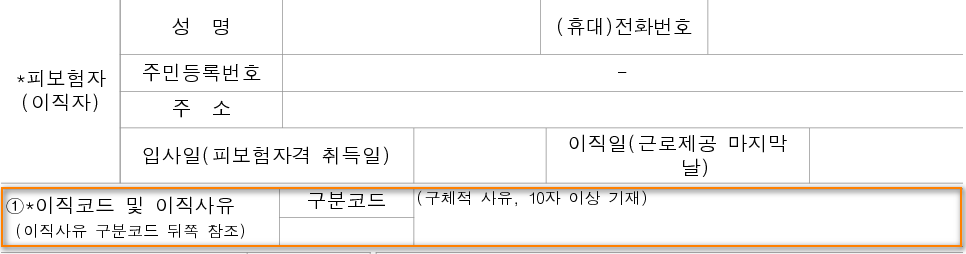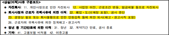 이직확인서는 보통 실업급여라 부르는 구직급여를 수급하기 위해 제출하는 경우가 대부분이라 실무적으로 사용할 코드는 강조된 영역 정도 됩니다.