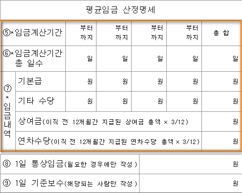 다음으로 평균임금 산정명세 부분을 작성하여야 하는데, 일반적인 퇴직금의 계산방식처럼 이직일 포함 3개월간의 급여를 적으면 됩니다.