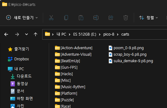 R36S의 롬파일이 들어 있는 SD카드의 'pico-8' 폴더 하위의 'carts' 폴더에 넣어주면 됩니다.
