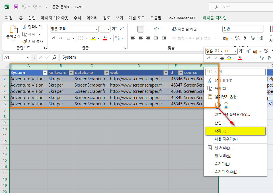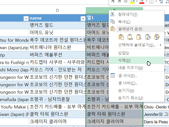 이후 필요가 없어진 열1을 선택한 후 마우스를 우클릭하여 나오는 항목 메뉴에서 '삭제'를 해줍니다.