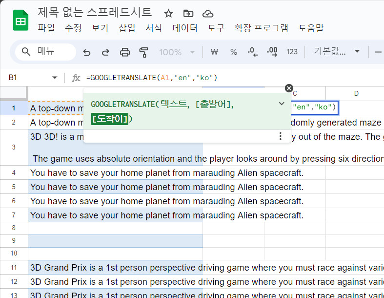 =googletranslate(번역할 셀, "원본언어", "번역할언어")