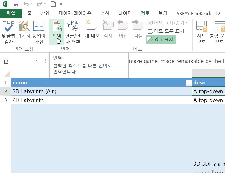 엑셀에서 제공하는 번역 버튼을 누르면 간단히 번역이 되는데...
