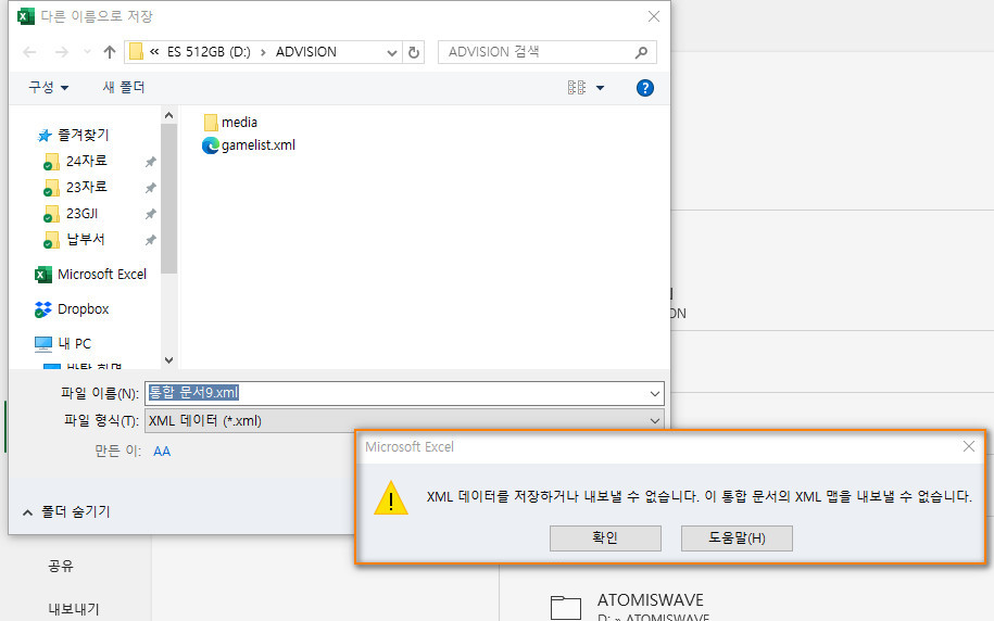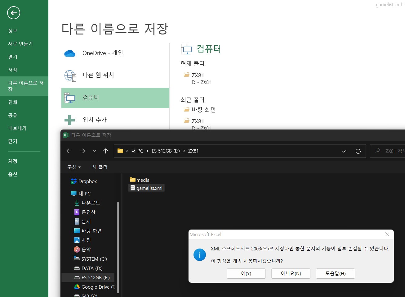 마지막으로 파일을 저장해 주면 되는데, 시작 시 불러온 gamelist.xml 파일이 있는 경로로 이동하여 저장 옵션 아래의 파일 형식을 'xml' 형식으로 바꿔준 후, 파일 이름을 'gamelist.xml'로 해주고 '저장'을 누르면 덮어쓰기 경고창이 뜹니다.