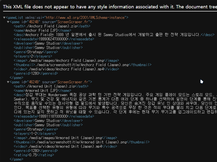 그래서 Skraper 이용후 gamelist.xml 파일을 또 만져줘야 하는데, 이게 파일 형식이 xml이다 보니 메모장 같은 프로그램으로 작업을 하려면 눈알이 빠지는 느낌입니다.