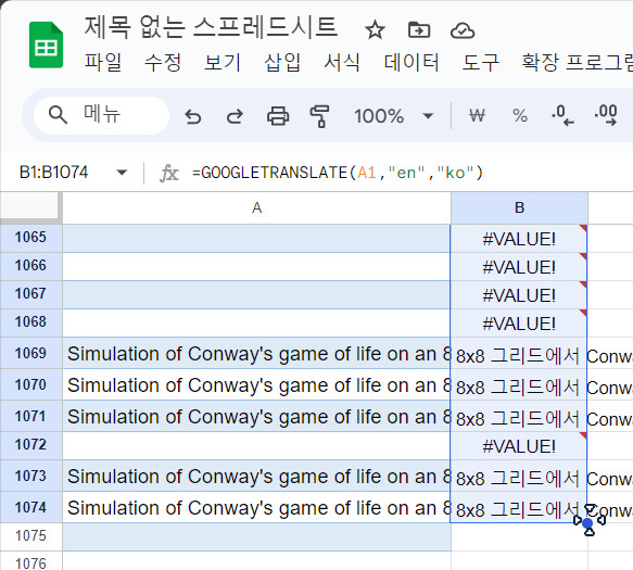 엑셀과는 달리 구글 스프레드시트의 번역기능은 함수이기에 번역한 셀의 모서리 부분을 잡고 드래그하면 아래의 내용들도 줄줄이 번역이 됩니다.