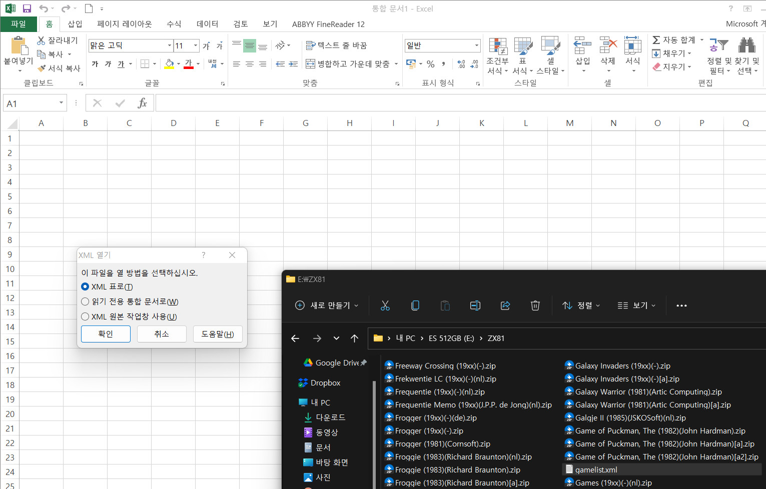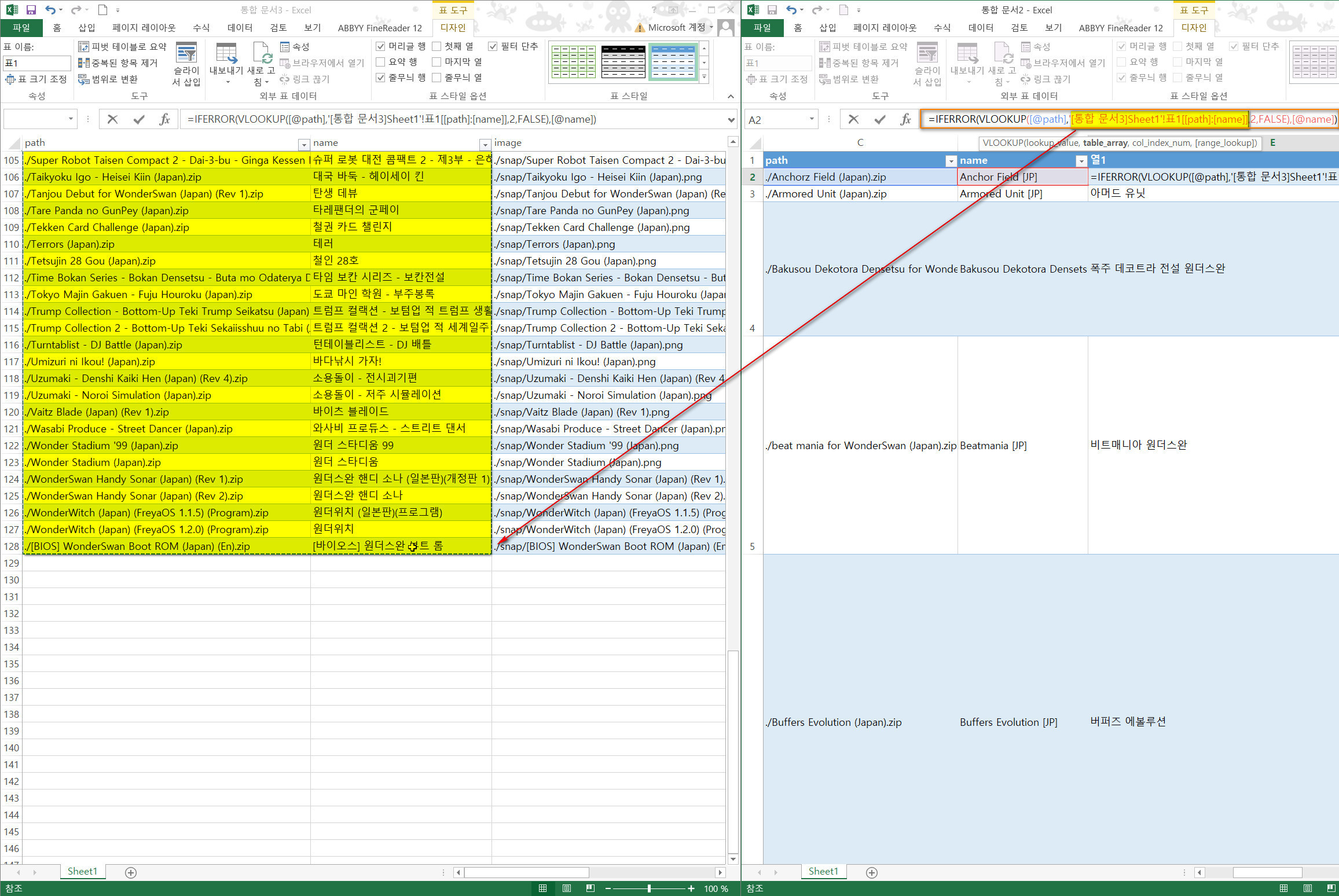 vlookup 함수를 이용하여 제목을 가져오기 위해, 작업하는 gamelist.xml 파일과 텐타클 팀의 한글화 된 제목의 xml 파일을 둘 다 엑셀에서 열어줍니다.
