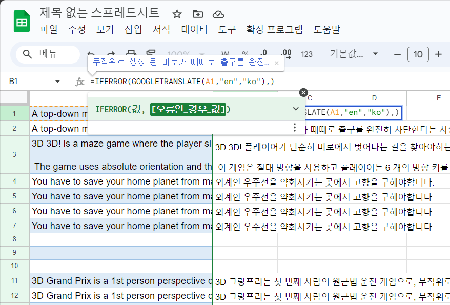 =IFERROR(GOOGLETRANSLATE(참조할 셀,"en","ko"),)