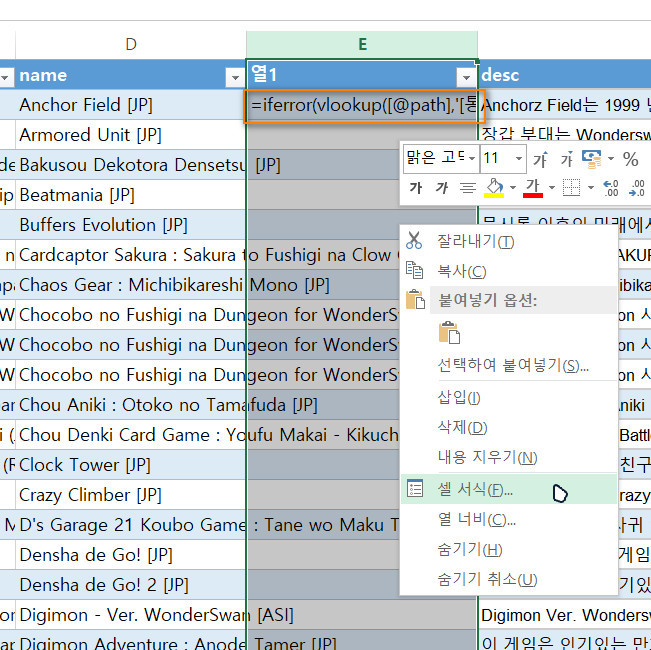 위의 사진처럼 제대로 값이 반환이 되지 않고 함수가 그대로 보이는 경우 추가된 한글 제목 열을 선택하고 마우스 우클릭하여 나오는 메뉴에서 '셀 서식'으로 들어갑니다.