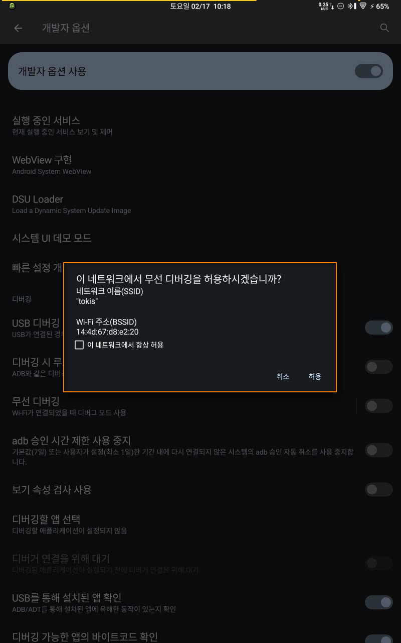 개발자 옵션에서 '무선 디버깅'을 활성화해 줍니다.