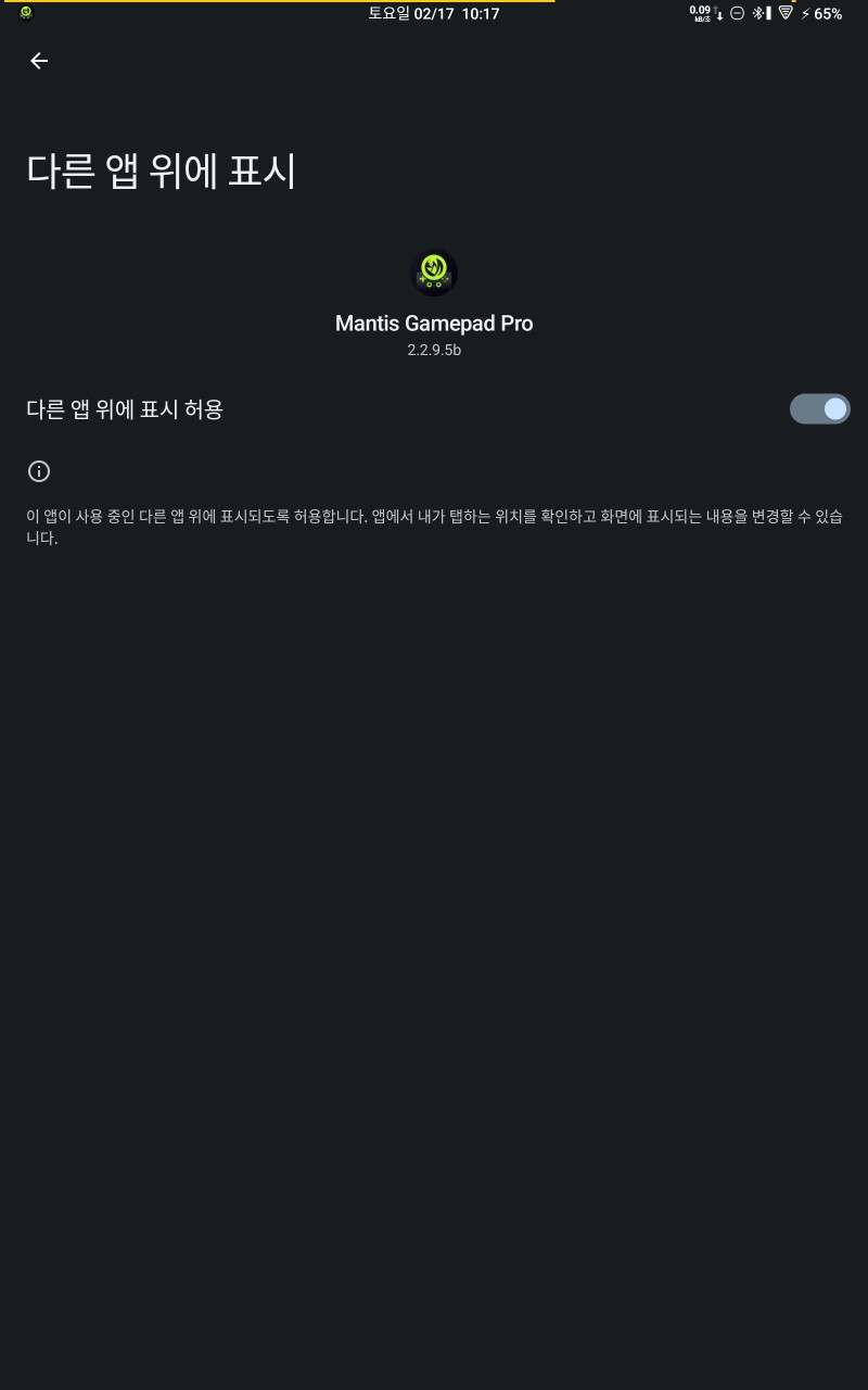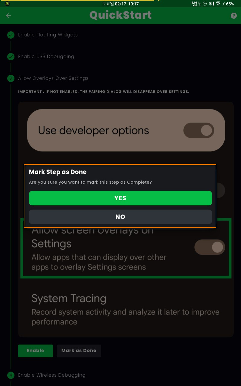 설정의 '개발자 옵션'에서 주사율 보기 아래의 '설정에서 화면 오버레이 허용'을 활성화해 준 후 맨티스 앱으로 돌아가 'Mark Step as Done' 부분에서 'YES'를 눌러줍니다.