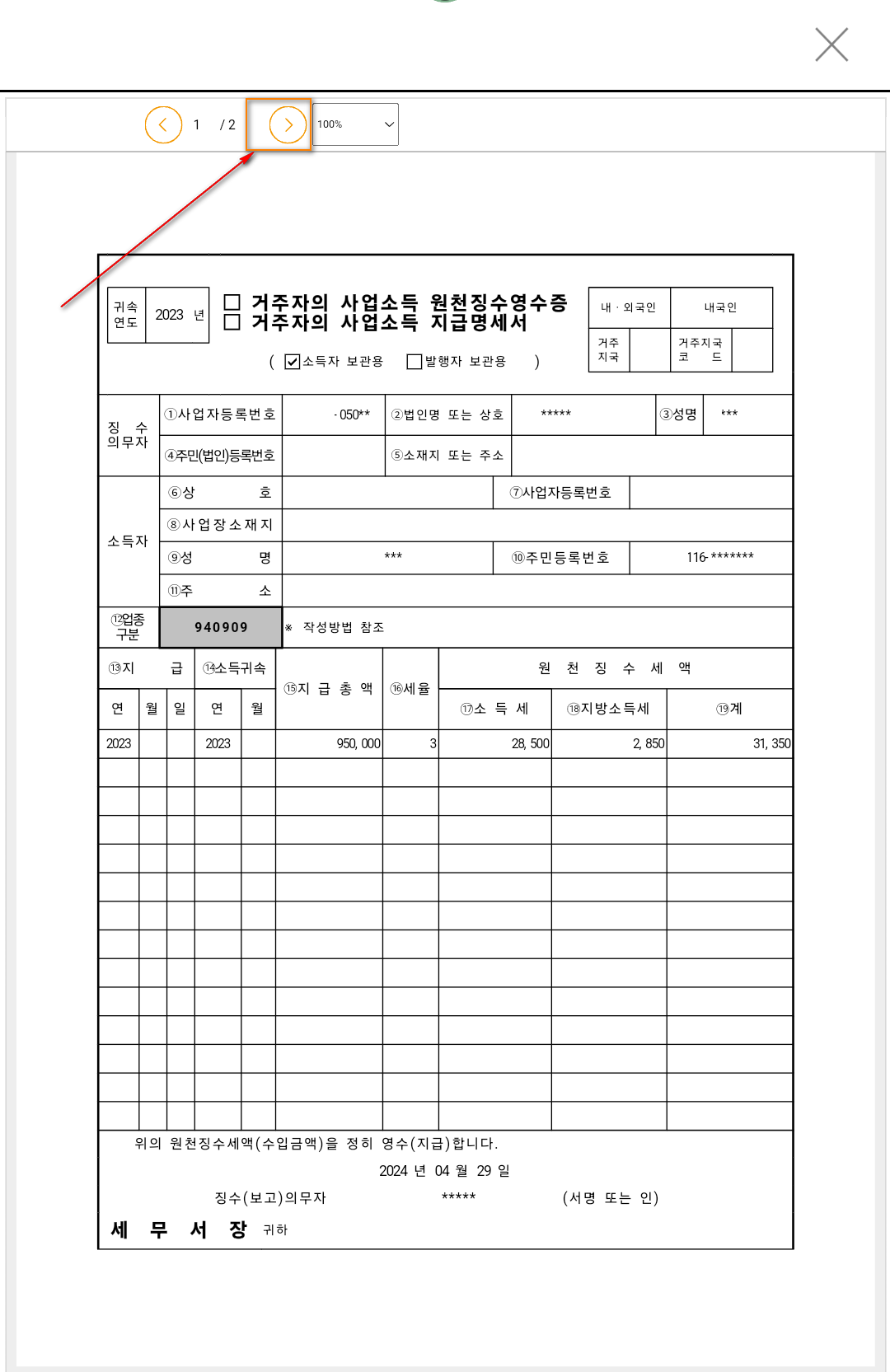 위와 같이 지급명세서가 출력되면 한장씩 전부 갈무리하여 보내주시면 됩니다.