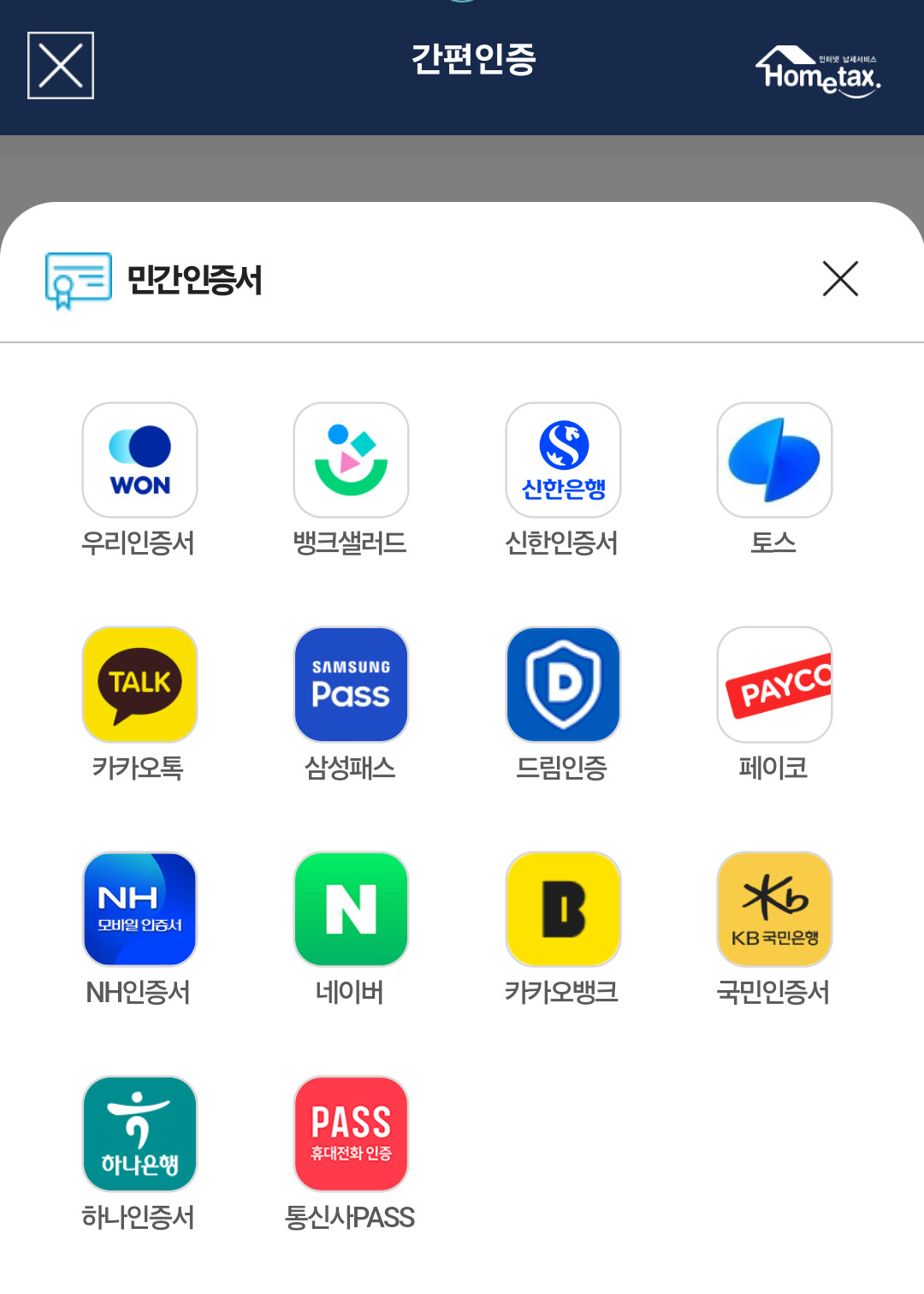 앱스토어나 플레이스토어에서 홈택스 앱을 설치하고 실행합니다.