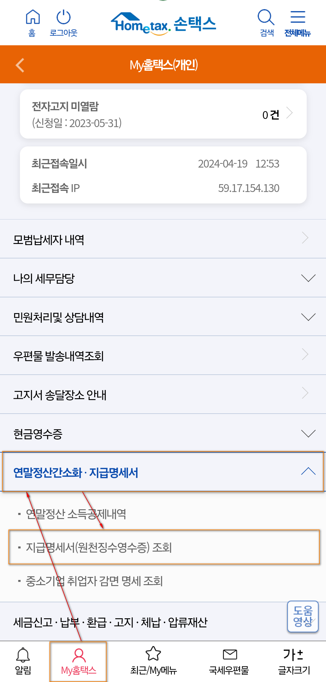 아래 메뉴 아이콘 중 'My홈택스' 메뉴로 들어간 후 '연말정산간소화.지급명세서' 메뉴 하위의 '지급명세서(원천징수영수증)조회' 메뉴로 진입합니다.