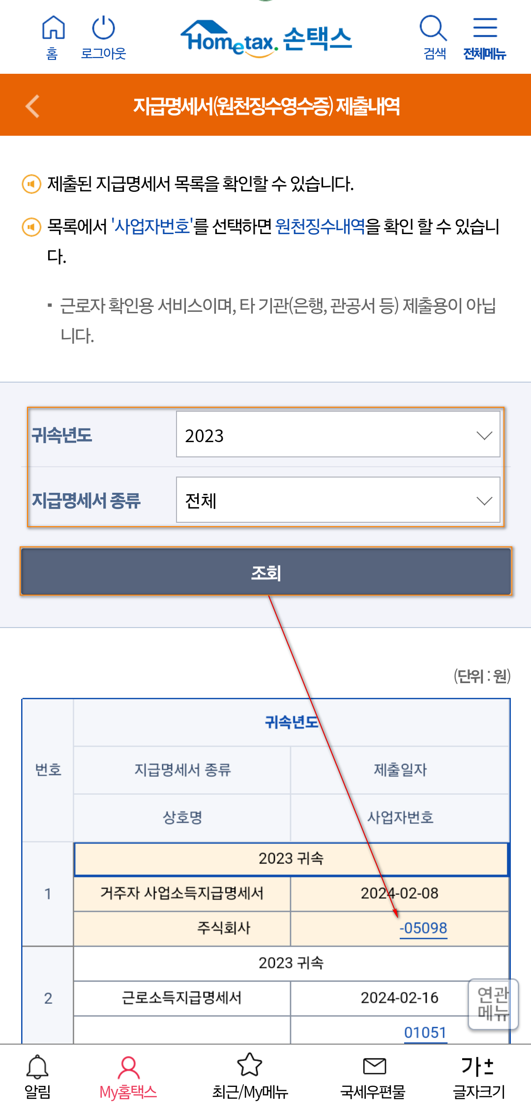 조회된 지급명세서들의 내용을 확인하기 위해 개별 지급명세서의 사업자등록번호를 누릅니다.