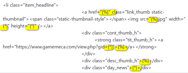 {%}를 입력하면 추후 RSS 생성 시 '제목'등으로 사용할 수 있는 변수를 추출하는 것이고, {*}를 입력하면 반복되는 고유 링크 등의 무시할 문자열의 영역을 지정해 주는 게 됩니다.