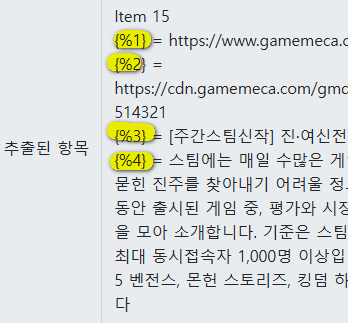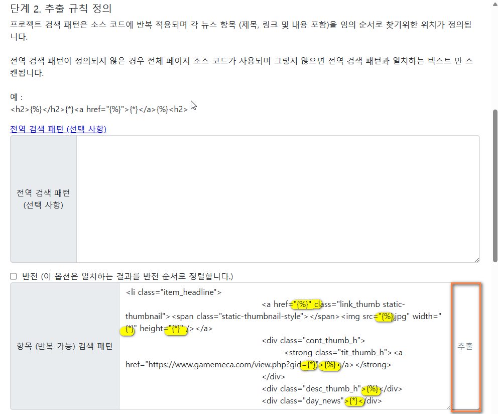 이렇게 불러온 코드 중 사용할 영역을 복사하여 '항목 (반복 가능) 검색 패턴'에 입력한 후 {%} 문자열과 {*} 문자열을 이용하여 반복되는 코드를 추출하게 입력한 후 '추출'을 누릅니다.