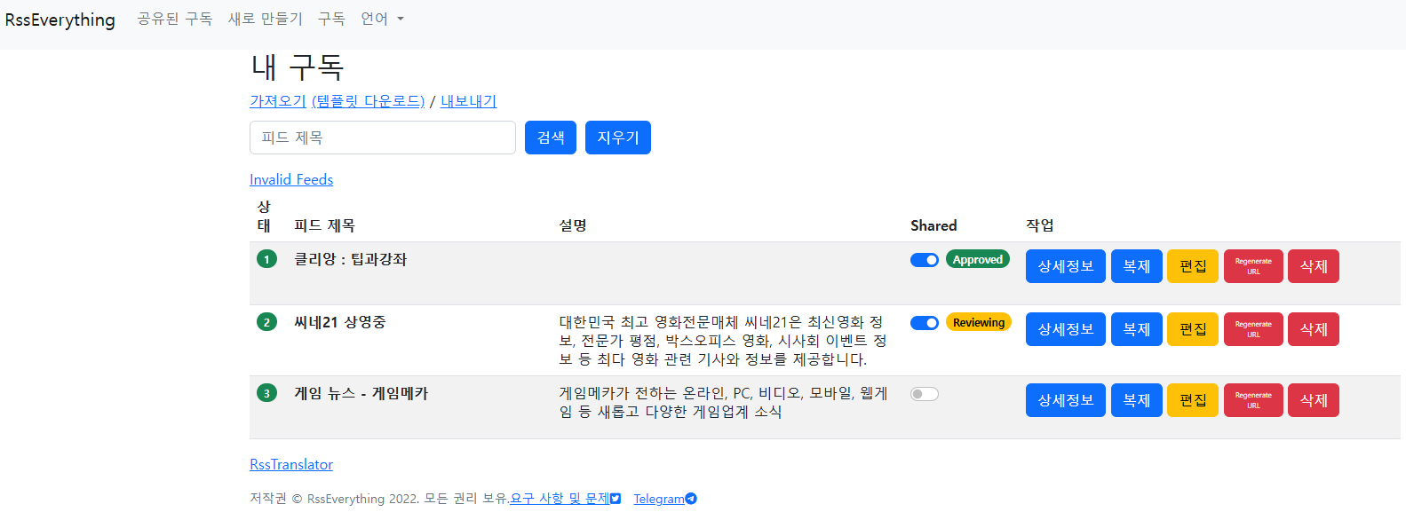 'RssEverything' 로고 부분을 누르면 위와 같이 내가 만든 RSS를 볼 수 있고, 만들어 둔 RSS를 편집하거나 다른 사용자들이 구독할 수 있도록 공개도 가능합니다.