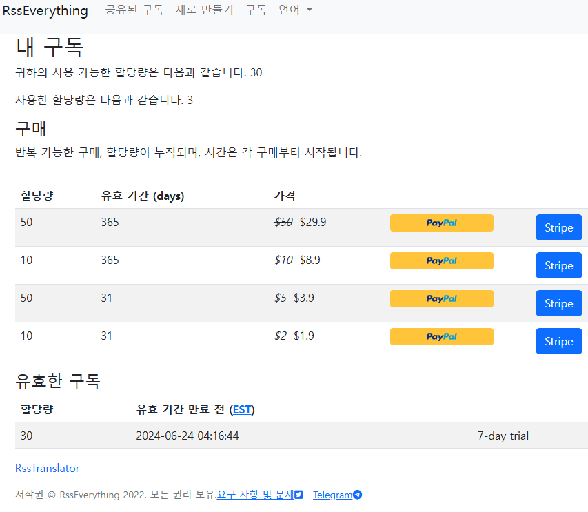 전술한 바와 같이 RssEverything은 유료 서비스인데... '구독' 메뉴를 누르면 유료결제 항목이 나옵니다.